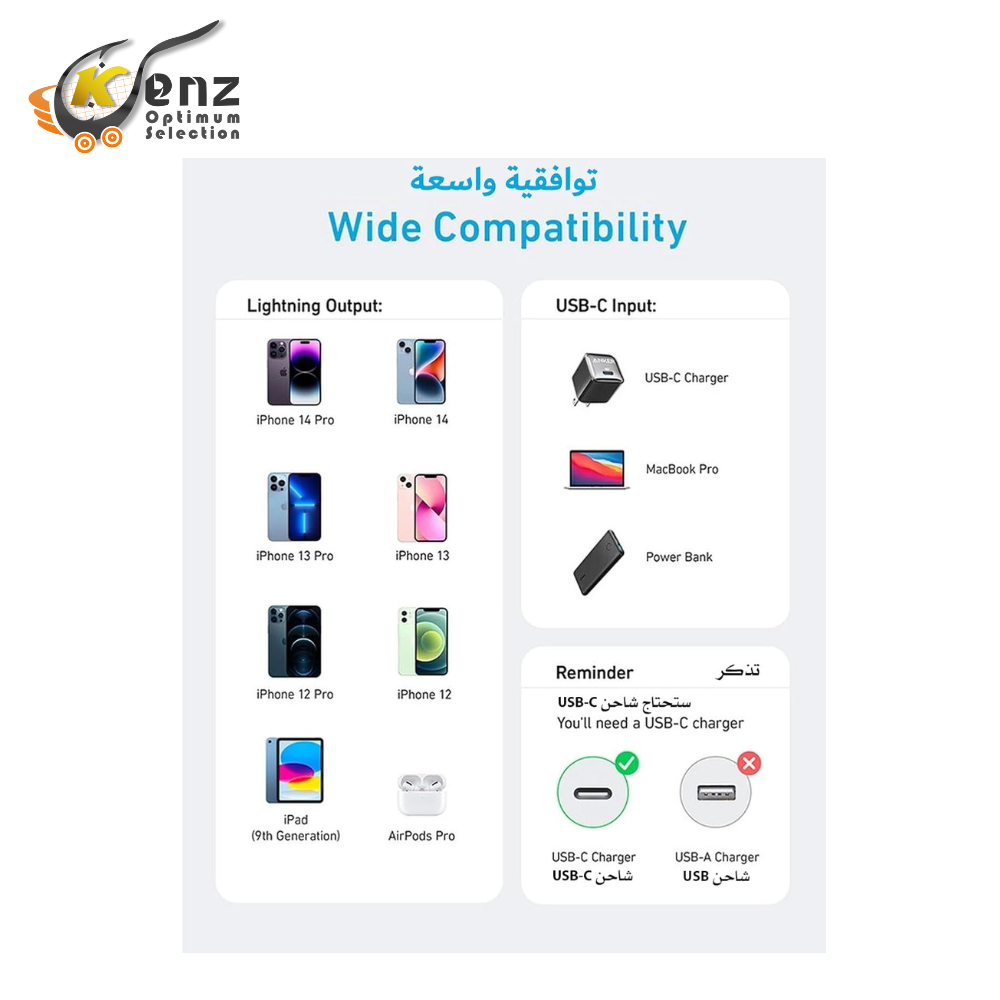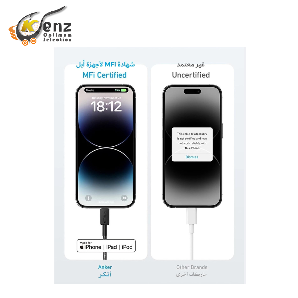 - معتمد من ام اف اي وتم اجتيازه لاختبار الجودة الصارم، لضمان ان أجهزتك من ابل تم شحنها بطريقة امنه، عند أقصى قدرة شحن للأجهزة..