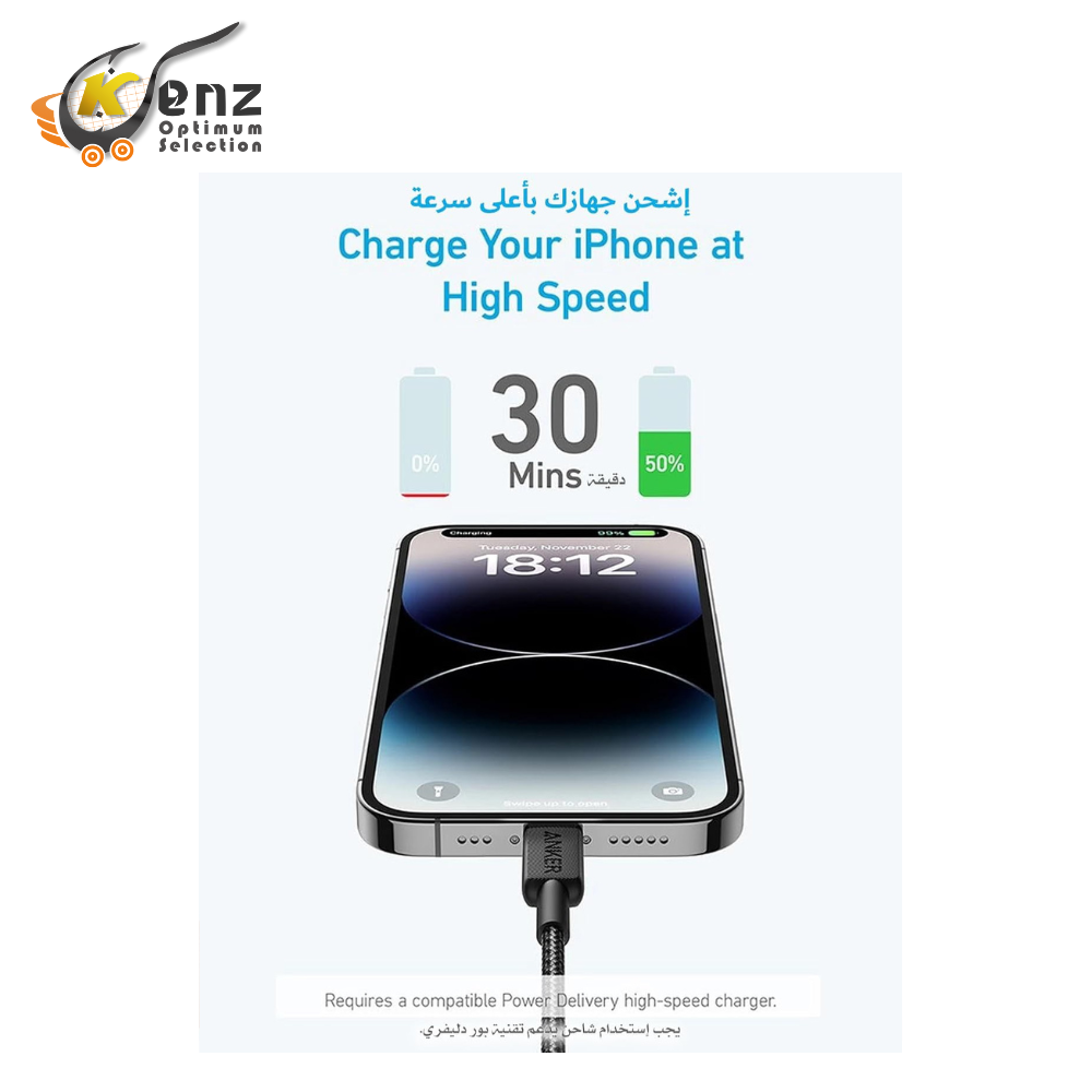 كابل لايتنينج من انكر USB نوع سي 322 [3 قدم معتمد من ام اف اي] باورلاين II لايفون 13 و13 برو 12 ماكس 12 11 X XS XR 8 بلس ايربودز أسود