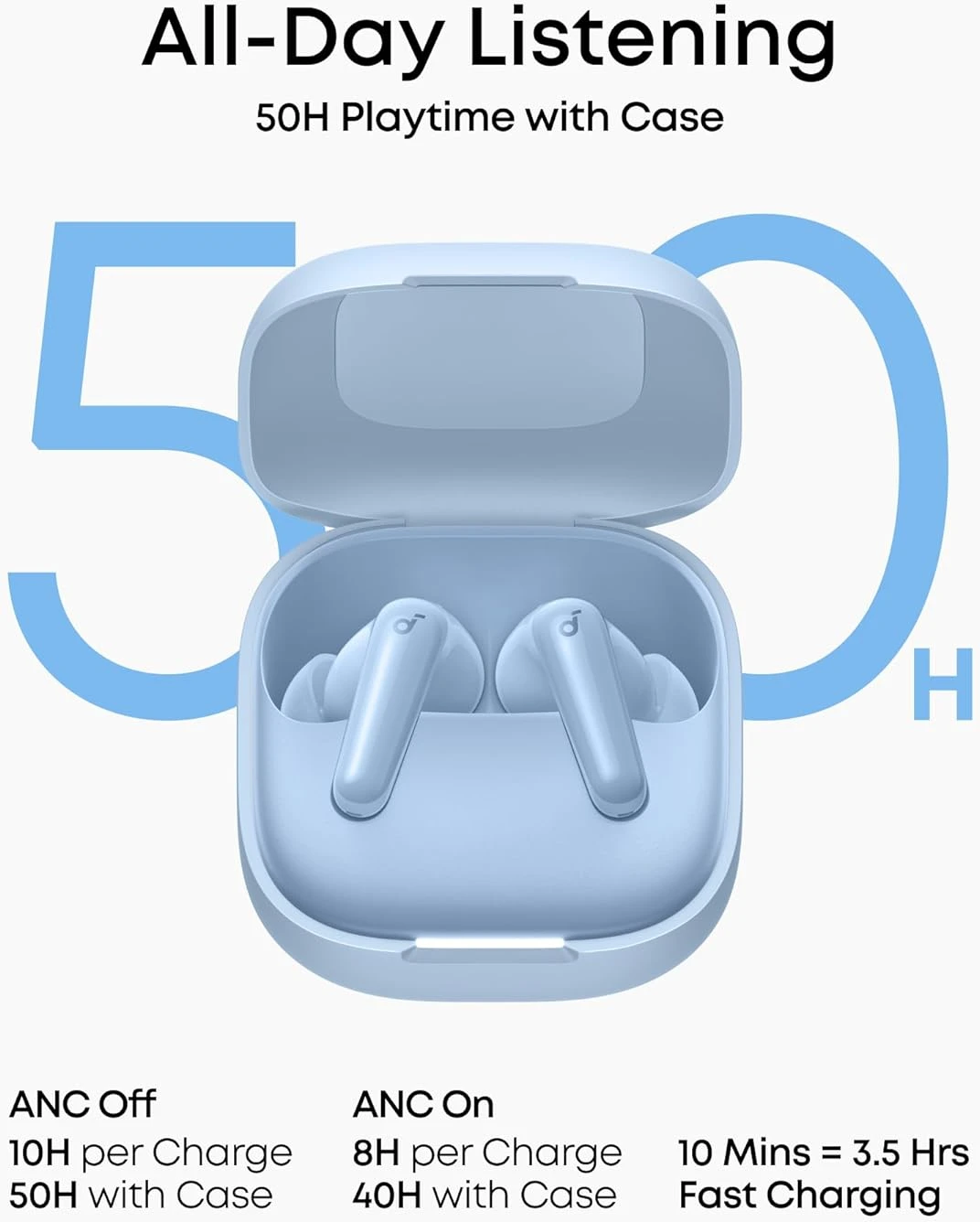 - وقت تشغيل طويل للغاية وشحن سريع: استمتع بوقت تشغيل يصل إلى 10 ساعات بشحنة واحدة (50 ساعة مع الحافظة). حتى مع تشغيل خاصية إلغاء الضوضاء النشطة، احصل على 8 ساعات لكل شحنة وإجمالي 40 ساعة. شحن سريع لمدة 10 دقائق يمنحك 3.5 ساعات