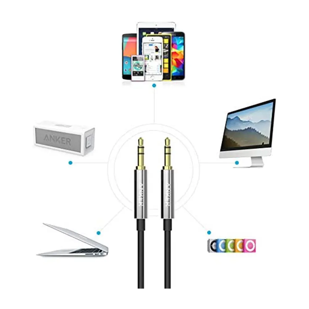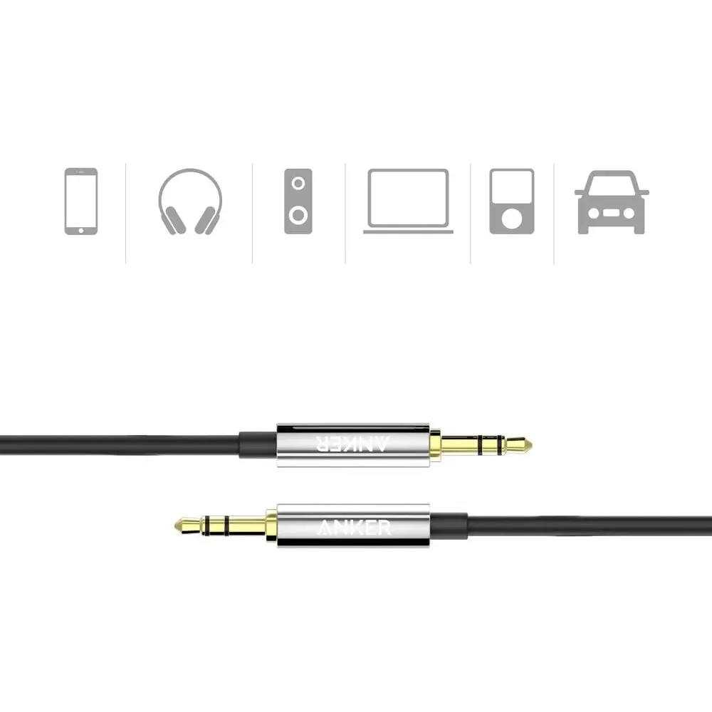 Anker Premium Auxiliary Audio CablePlug in and play your sound. Connect ANY Device Phones, tablets, iPods, CD & cassette players. Link just about anything to your home or car stereo via its 3.5mm aux port. High Quality Audio Our cables are built to the exact same standards as leading headphone brands. 24 carat gold-plated contacts ensure the purest possible sound experience. Incredibly Durable We bent this cable over 10000 times and saw no damage or change in performance. Premium metal connectors make it extra durable. |