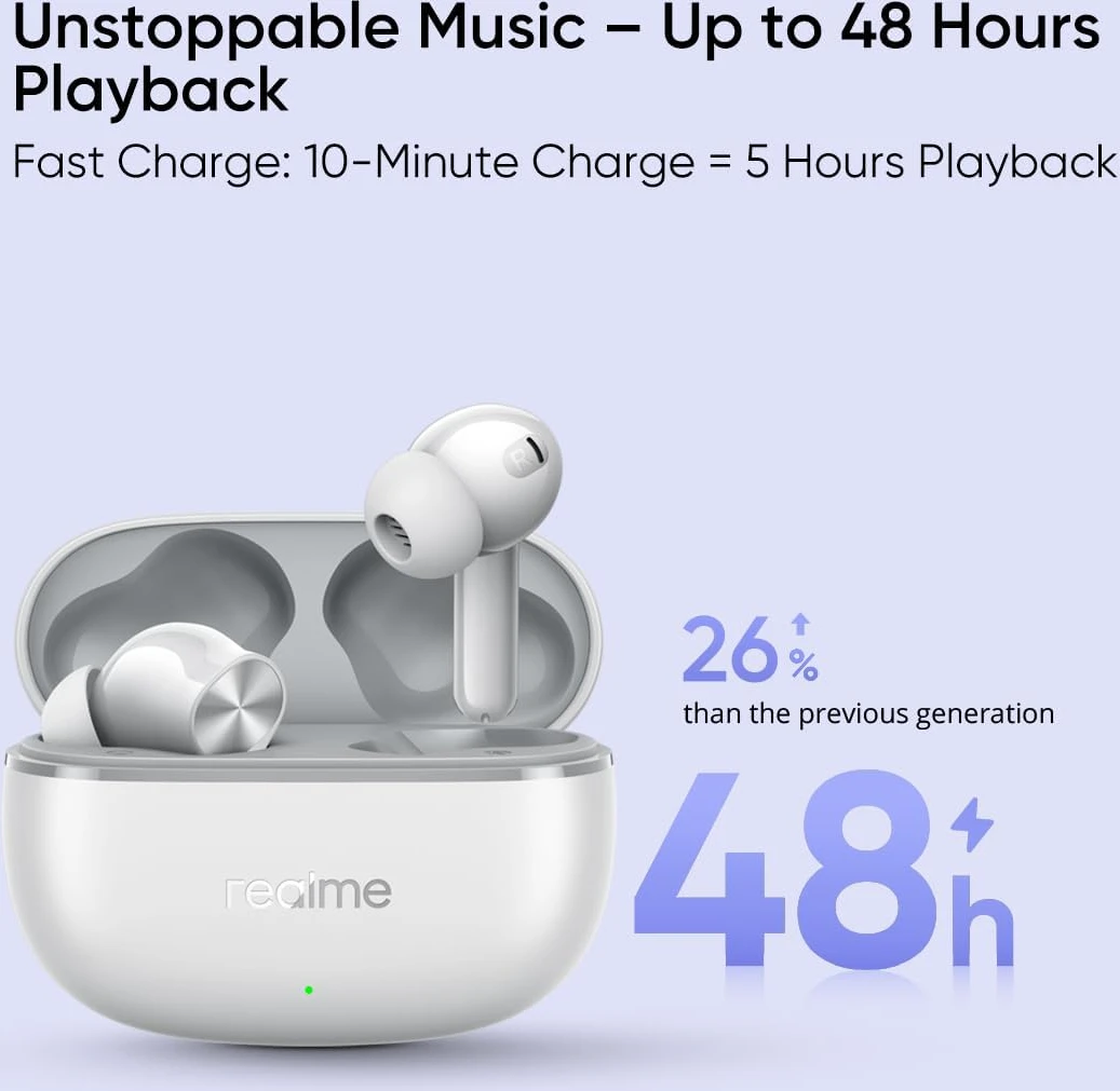 Experience high-quality audio with the Realme Buds T200 Lite Bluetooth in-Ear Earbuds in Aurora purple. Featuring a 12.4mm Dynamic Bass Driver, these earbuds deliver deep and powerful sound. Enjoy up to 48 hours of total playback with the charging case, and a quick 10-minute charge provides 5 hours of listening time. Equipped with AI Environmental Noise Cancellation (ENC), they ensure clear calls by minimizing background noise. The earbuds support low-latency gaming mode, and dual-device connectivity, and have an IPX4 water resistance rating, making them suitable for workouts and outdoor activities. With Bluetooth 5.4 and Google Fast Pair, connecting to your devices is seamless and efficient.