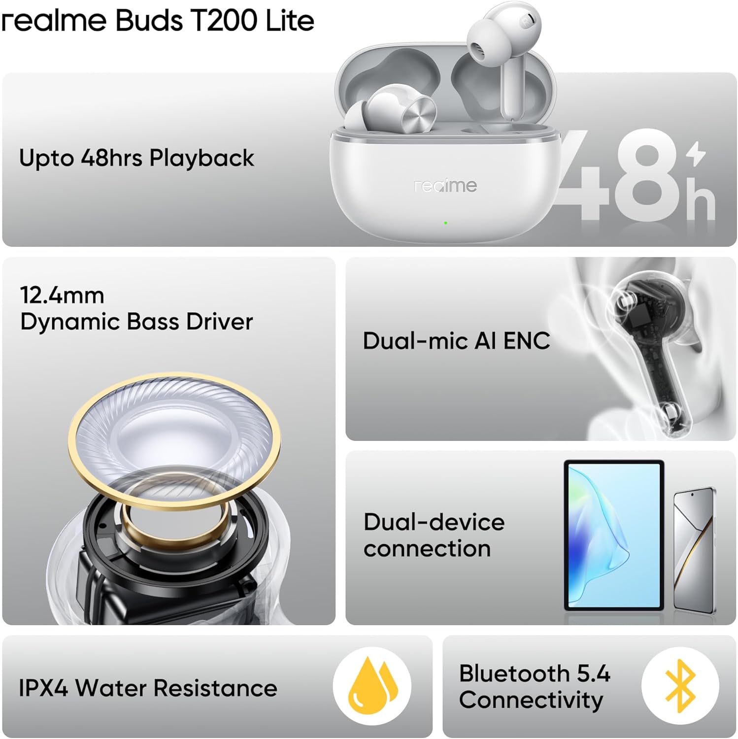realme Buds T200 Lite Bluetooth in Ear Earbuds,4 Mic, AI ENC for Calls,48 Hours Total Playback with Fast Charging and Ultra Low Latency Gaming TWS, Google Fast Pair, with mic – (Gray)