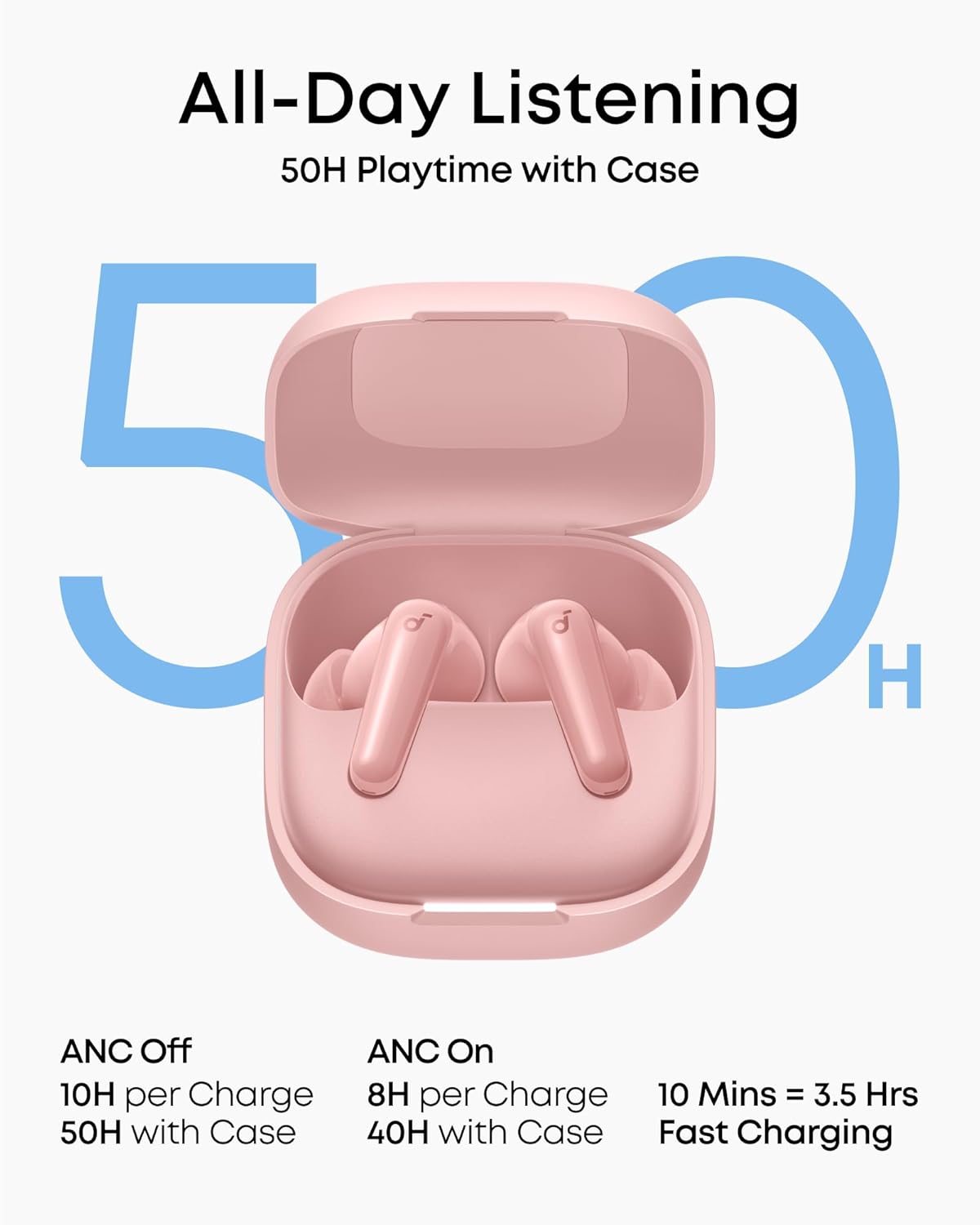 - Ultra-Long Playtime & Fast Charging: Enjoy up to 10 hours of playtime on a single charge (50 hours with the case). Even with ANC on, get 8 hours per charge and 40 hours total. A quick 10-minute charge gives 3.5 hours of listening.