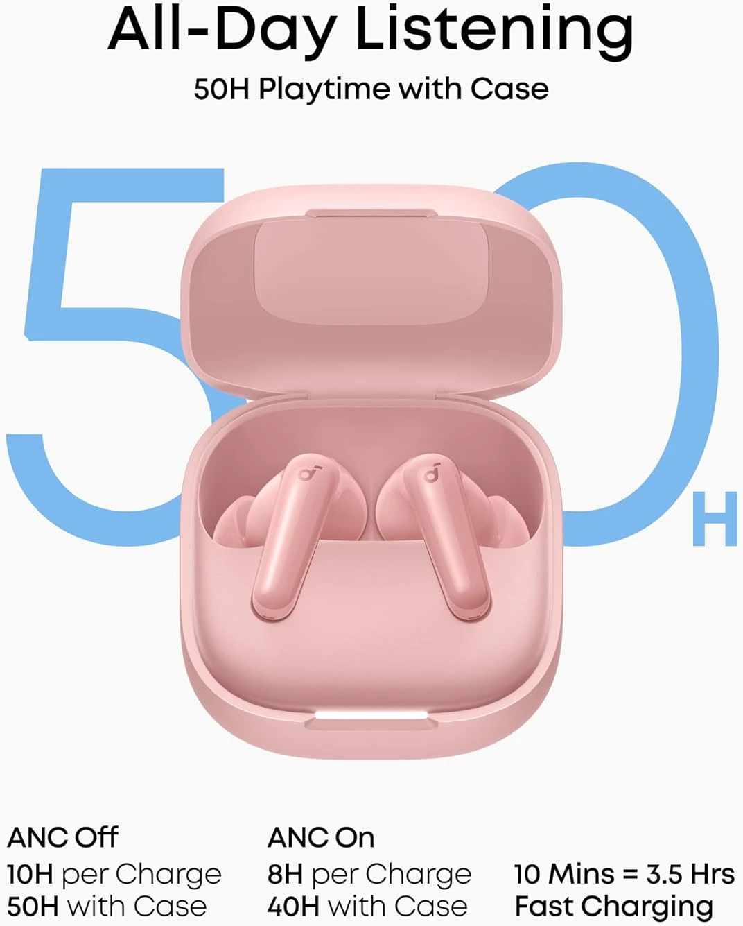 • Ultra-Long Playtime & Fast Charging: Enjoy up to 10 hours of playtime on a single charge (50 hours with the case). Even with ANC on, get 8 hours per charge and 40 hours total. A quick 10-minute charge gives 3.5 hours of listening.